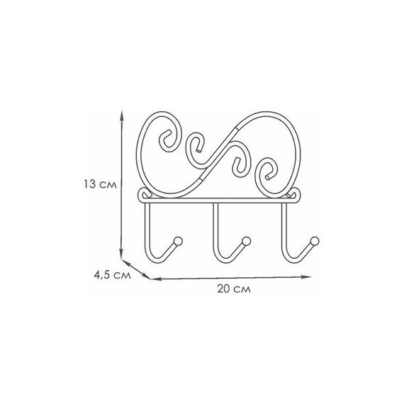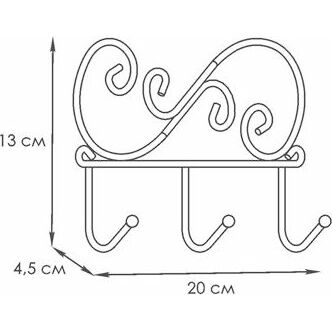 Надежная сварная конструкция. - компактная вешалка с 3-мя крючками. - допустимая нагрузка до 5 кг на крючок. - Расстояние между крепёжными отверстиями 185 мм. Материал Проволока диаметром 4 мм; стальные шарики; полимерно-порошковое покрытие. Габариты (Д*Ш*В) 20х4,5х13 см.