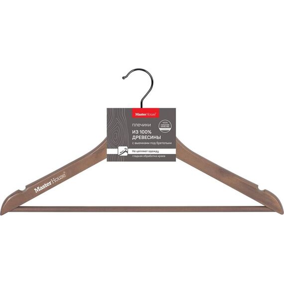 Плечики деревянные, цвет: серый, материал: лотос А класс, 44см, с перекладиной и выемками, с черным крючком, индивидуальная упаковка: картонный ремень
