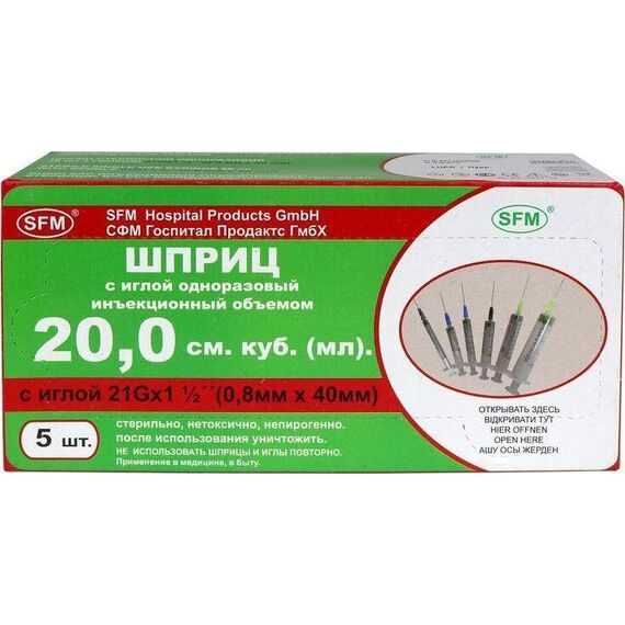 Шприц SFM Шприц - 20мл. (3-х) SFM, Германия однораз. стер. с иглой 0,80 x 40 - 21G, упаковка №5 (БЕЗ ЛАТЕКСА) ( блистер)