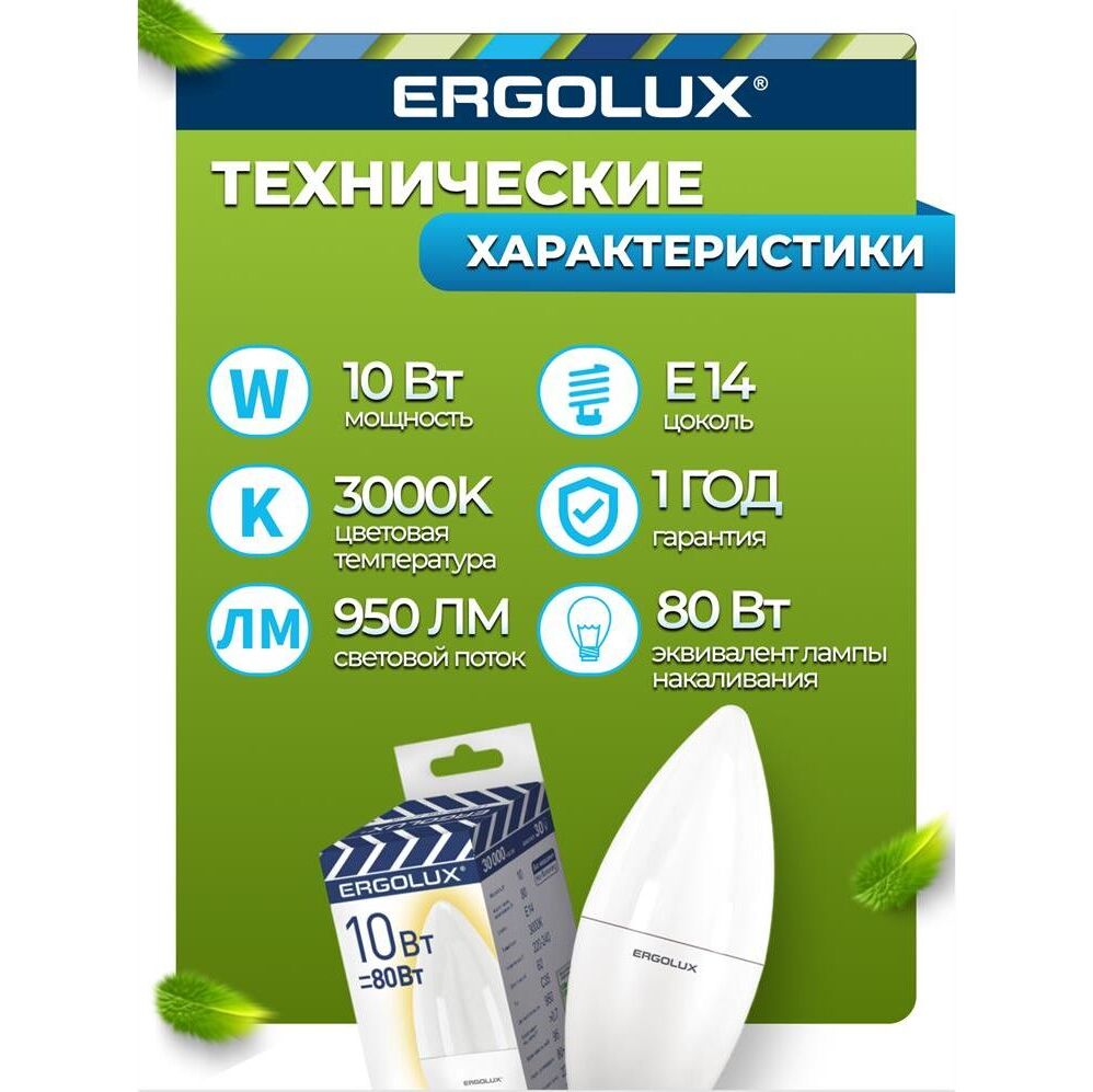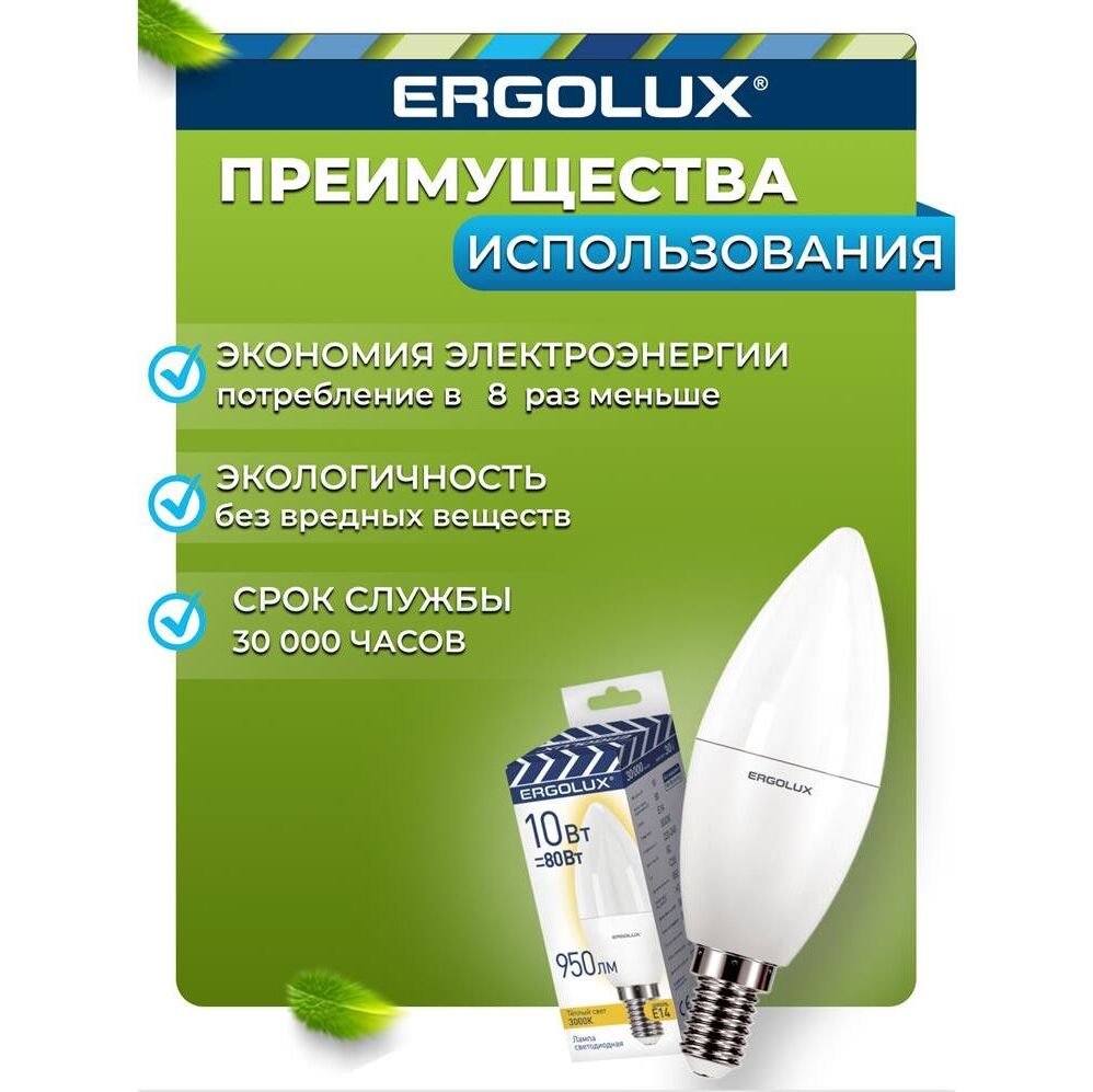 Светодиодная лампа ERGOLUX может быть применена в жилых, офисных и производственных в помещениях, а также в уличных светильниках со степенью защиты не менее IP54. LED лампа, Мощность 10 Вт, Эквивалент лампы накаливания 80 Вт, Цоколь E14, Цветовая температура 3000 К, Световой поток 950 лм, Угол светового пучка 220, Индекс цветопередачи 80+