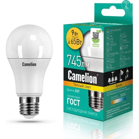 СДЛ Camelion - это инновационное решение, разработанное на основе новейших светодиодных технологий (LED). Предназначена для освещения жилых, офисных и коммерческих помещений. Встроенный источник питания позволяет использовать СДЛ Camelion в стандартных патронах. LED лампа, мощность, Вт - 9, напряжение, В - 170-265, световой поток, лм - 810, форма колбы - груша, цвет колбы - белый, цоколь E27, цветовая температура, К - 3000, угол светового пучка - 270, индекс цветопередачи 80+, срок службы, ч. - 30000