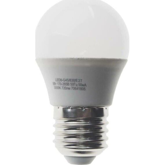 LED лампа, мощность, Вт - 8, напряжение, В - 170-265, световой поток, лм - 720, форма колбы - шар, цвет колбы - белый, цоколь E27, цветовая температура, К - 3000, угол светового пучка - 220, индекс цветопередачи 80+, срок службы, ч. - 30000