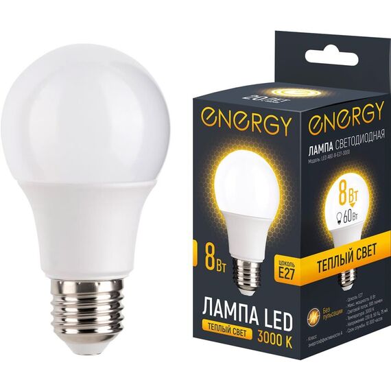 Лампа светодиодная Energy LED А60-8-E27-3000 Цоколь E27 Световой поток 595 люмен Срок службы 10 000 часов Цветовая температура 3000 К (теплый свет) Класс энергоэффективности А Без пульсации Напряжение 230 В, 50 Гц Диаметр 5,9 см Высота 10,8 см Мощность аналога лампы накаливания 60 Вт Мощность 8 Вт
