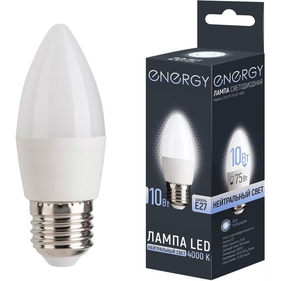 Лампа светодиодная Energy LED С37-10-E27-4000 Цоколь E27 Световой поток 750 люмен Срок службы 10 000 часов Цветовая температура 4000 К (нейтральный свет) Класс энергоэффективности А Без пульсации Напряжение 230 В, 50 Гц Диаметр 3,8 см Высота 10,9 см Мощность аналога лампы накаливания 75 Вт Мощность 10 Вт