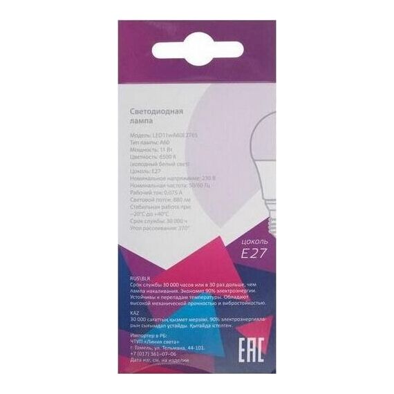 "Светодиодная лампочка 11 Вт является аналогом лампы накаливания 90 Вт для средней комнаты понадобится 3 таких лампочки. Стабильный свет без падения яркости в течение всего срока службы (30 000 часов) за счет использования светодиодов известных производителей. Лампа работает в диапазоне от 174В до 265В - не перегорит и не потеряет яркость при скачках напряжения в сети. Цвет свечения лампы - 6500 К дневной, максимально близкий к свету солнца и подойдет для ванной или рабочего места. Здоровый свет без мерцания не утомляет глаза, а высокий индекс цветопередачи передает естественные цвета и оттенки. По размеру сопоставима с обычной лампочкой накаливания, но экономит до 90% энергии по сравнению с ней. Экологически безопасна и не требует утилизации. 2 года гарантии"