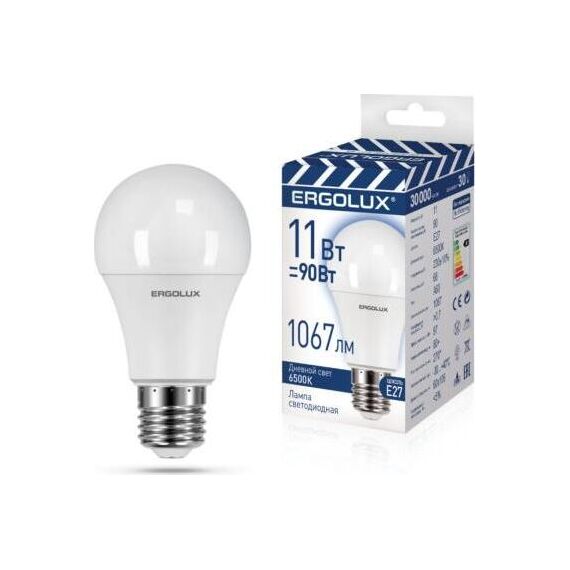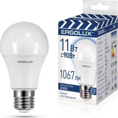 Светодиодная лампа ERGOLUX может быть применена в жилых, офисных и производственных в помещениях, а также в уличных светильниках со степенью защиты не менее IP54. LED лампа, Мощность 11 Вт, Эквивалент лампы накаливания 90 Вт, Цоколь E27, Цветовая температура 6500 К, Световой поток 1067 лм, Угол светового пучка 270, Индекс цветопередачи 80+