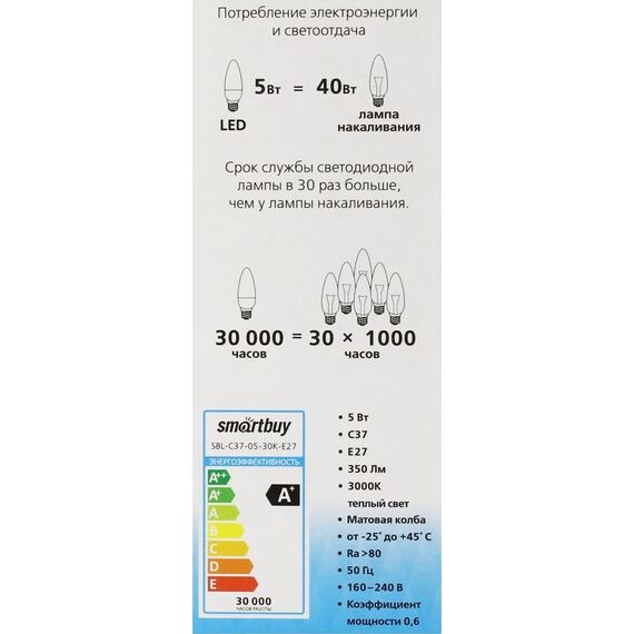 Характеристики SBL-C37-05-30K-E27 Мощность, Вт 5 Аналог лампы накаливания 40 Высота, мм 100 Диаметр, мм 37 Диапазон рабочих температур - 25..+50°C Индекс цветопередачи, CRI Ra>80 Материал Пластик, металл Колба Матовая Напряжение, В 220-240 В Световой поток, лм 350 Светоотдача 70 Совместимость с выключателем с подсветкой нет Срок службы 30 000 часов Форма колбы Свеча Цветовая температура, К 3000 Тип цоколя Е27