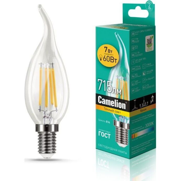 CAMELION LED7-CW35-FL/830/E14 (Эл.лампа светодиодная 7Вт 220В) Цоколь: E14 Мощность: 7 Вт Эквивалент ЛН: 60 Вт Световой поток: 715 Лм Цветовая температура: 3000 K Напряжение: 170-265 В Покрытие колбы: CL/прозрачная Тип трубки/колбы: CW35 Размеры: 113x35 мм Угол светового пучка: 330 ° Индекс цветопередачи (Ra): 82+ Коэффициент пульсации: < 1% Срок службы: 30000 часов Гарантия: 24 мес