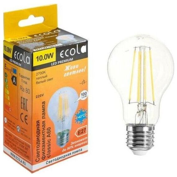 Лампа ECOLA N7LW10ELC 10,0W ФИЛАМЕНТ A60 220-240V E27 2700K 360° прозр. нитевидная (RA 80, 100 LM)