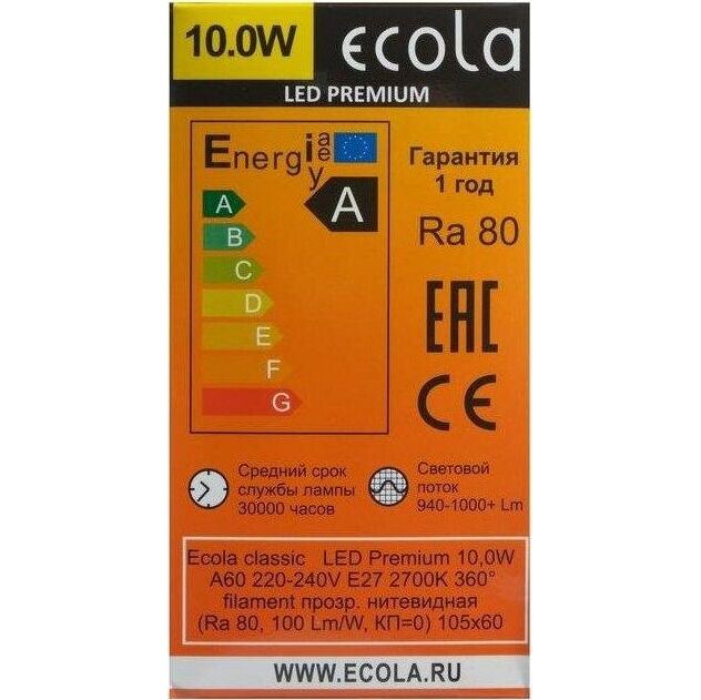 Ecola classic LED Premium, Цоколь E27, Мощность 10,0W, Цветовая температура 2700K, Напряжение 220В, Срок службы 30 000 часов, Размер 105x60 мм, Прозрачное стекло. 360° filament прозр. нитевидная (Ra 80, 100 Lm/W, КП=0).