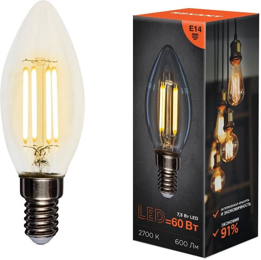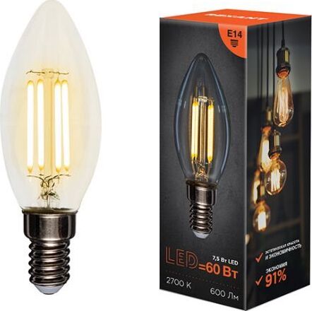 Филаментная прозрачная лампа REXANT CN35 в форме свечи мощностью 7.5Вт с цоколем E14 и с теплым белым свечением в 2700K прекрасно подходит для дизайнерского освещения комнат, домов, гостиниц, кафе, и других объектов. Филаментные светодиодные лампочки вобрали в себя все лучшие свойства, присущие матричным LED-лампам и традиционным лампам накаливания. Они обладают высокой энергоэффективностью и долгим сроком службы. За счет распространения света во всех направлениях, филаментные лампочки REXANT потребляют еще меньше электроэнергии при более высокой яркости. Утилизации ламп не требует особых мер. Их можно вынести с бытовыми отходами, так как они безопасны и для окружающей среды.