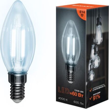 Филаментная прозрачная лампа REXANT CN35 в форме свечи мощностью 7.5Вт с цоколем E14 и с белым свечением в 4000K прекрасно подходит для дизайнерского освещения комнат, домов, гостиниц, кафе, и других объектов. Филаментные светодиодные лампочки вобрали в себя все лучшие свойства, присущие матричным LED-лампам и традиционным лампам накаливания. Они обладают высокой энергоэффективностью и долгим сроком службы. За счет распространения света во всех направлениях, филаментные лампочки REXANT потребляют еще меньше электроэнергии при более высокой яркости. Утилизации ламп не требует особых мер. Их можно вынести с бытовыми отходами, так как они безопасны и для окружающей среды.