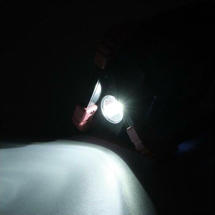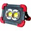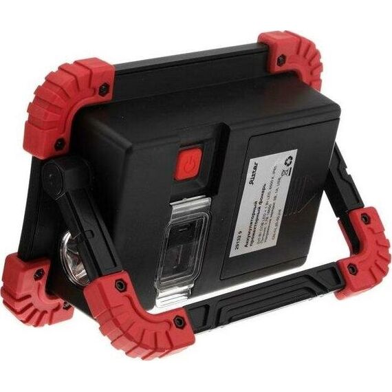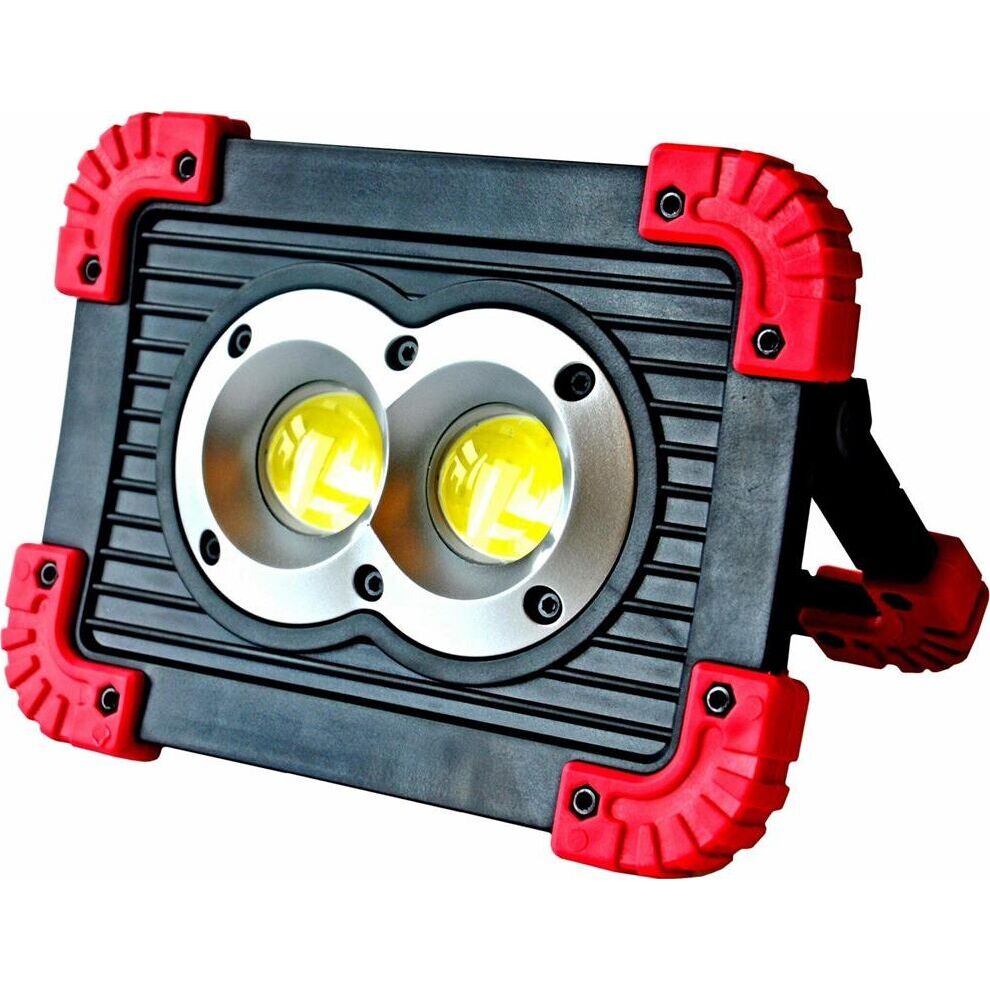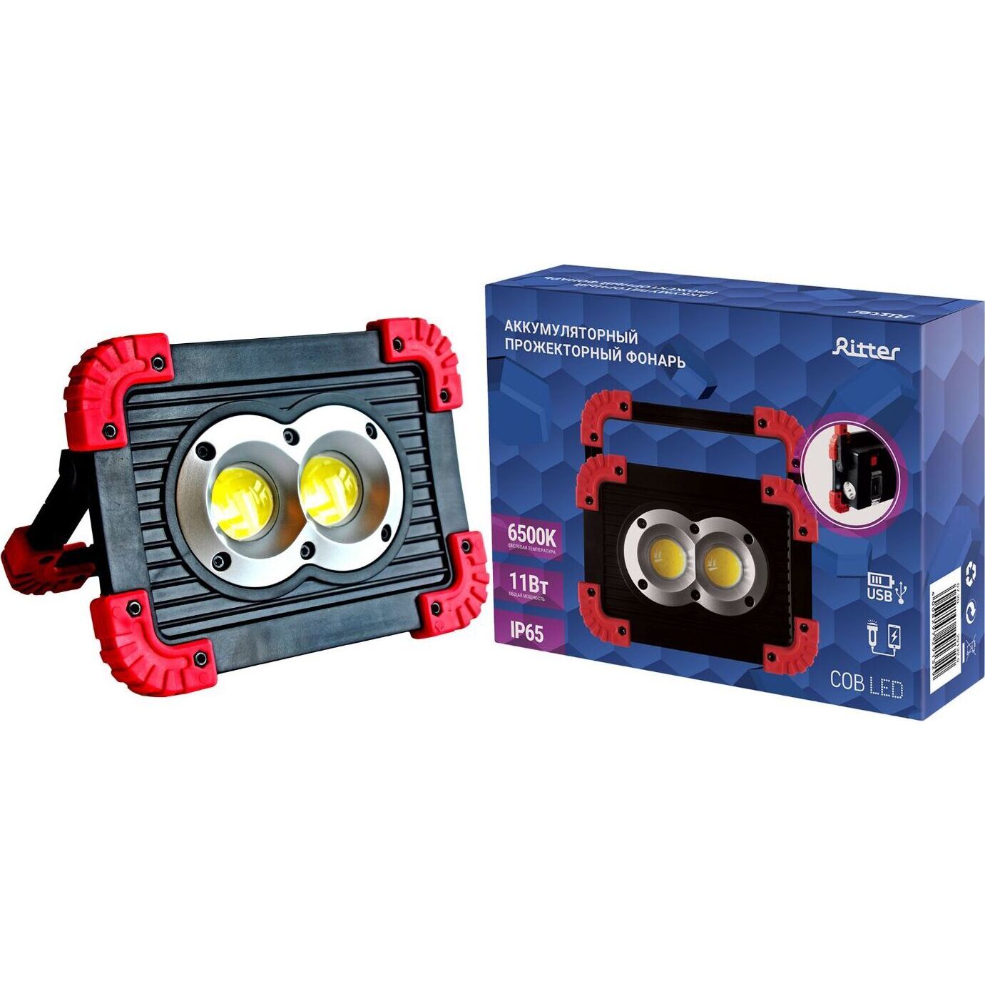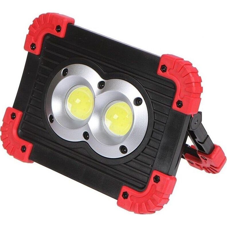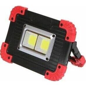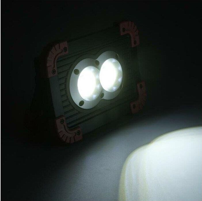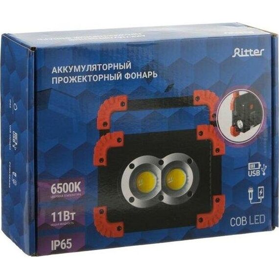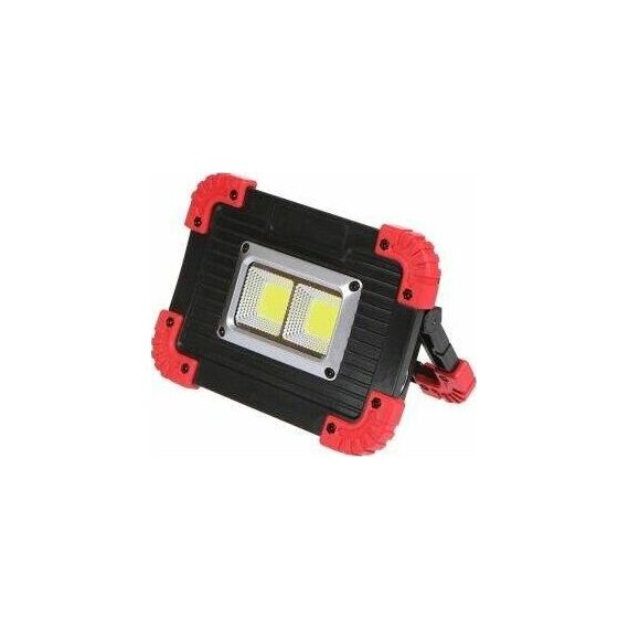 Аккумуляторный светодиодный прожектор. Источник света - 2 COB-светодиода линзованных + светодиод на 1 Вт. Источник питания - заменяемый литиевый аккумулятор 3000мАч. Размер - 173x126x45мм. Режимы работы - ON-OFF. Режимы света - яркий, приглушенный, вспышками. Световой поток - 1100Лм. Кнопка включения-выключения на обратной стороне фонаря, порт USB (кабель в комплекте), кнопка переключения режимов света, индикатор заряда батареи. Функция Powerbank для зарядки мобильных устройств. Эргономичная регулируемая ручка для переноски или установки в необходимом месте.