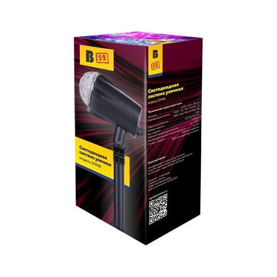 B52 "SHINE-N" - уличная светодиодная система с проекцией абстрактного рисунка. 3 цвета свечения: синий/белый/желтый. Работает в атоматическом режиме. Разрешено эксплуатировать при температуре воздуха до -30°С. Длина шнура от вилки до системы - 3м.