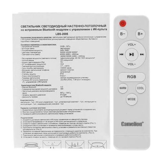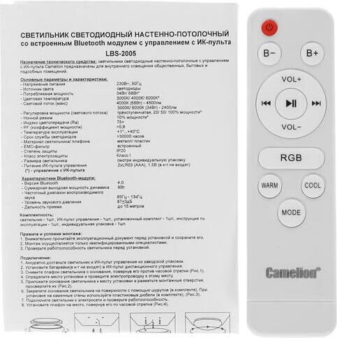 Настенно-потолочный LED светильник Camelion LBS-2005 68Вт, размер 500х100х500мм, источник света - встроенные светодиоды, мощность 68Вт, световой поток - 2400-4800лм. Bluetooth колонка, пульт