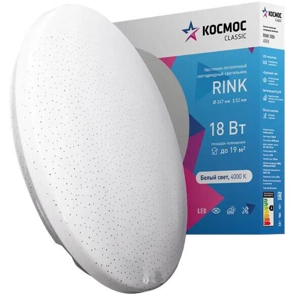 Настенно-потолочный светодиодный светильник Космос Classic RINK 18Вт 230В. Дневной белый свет 4000K. LED технология. Распределённый световой поток. Площадь освещения 19 м². Размер светильника Ø247х52мм. "Здоровый" свет - свет без пульсаций и мерцания не утомляет глаза. Цветопередача Ra>80 - предметы выглядят натурально, свет не кажется неприятным. Подходит как для натяжных потолков, так и для стандартных поверхностей, благодаря чему применение возможно практически в любом помещении дома: на кухне, в спальне или даже в коридоре. Помимо технических характеристик стоит отметить простоту установки: крепление доступно даже тем, кто ранее не занимался монтажными работами самостоятельно. Гарантия 2 года. Степень защиты IP40. Инструкция в комплекте.