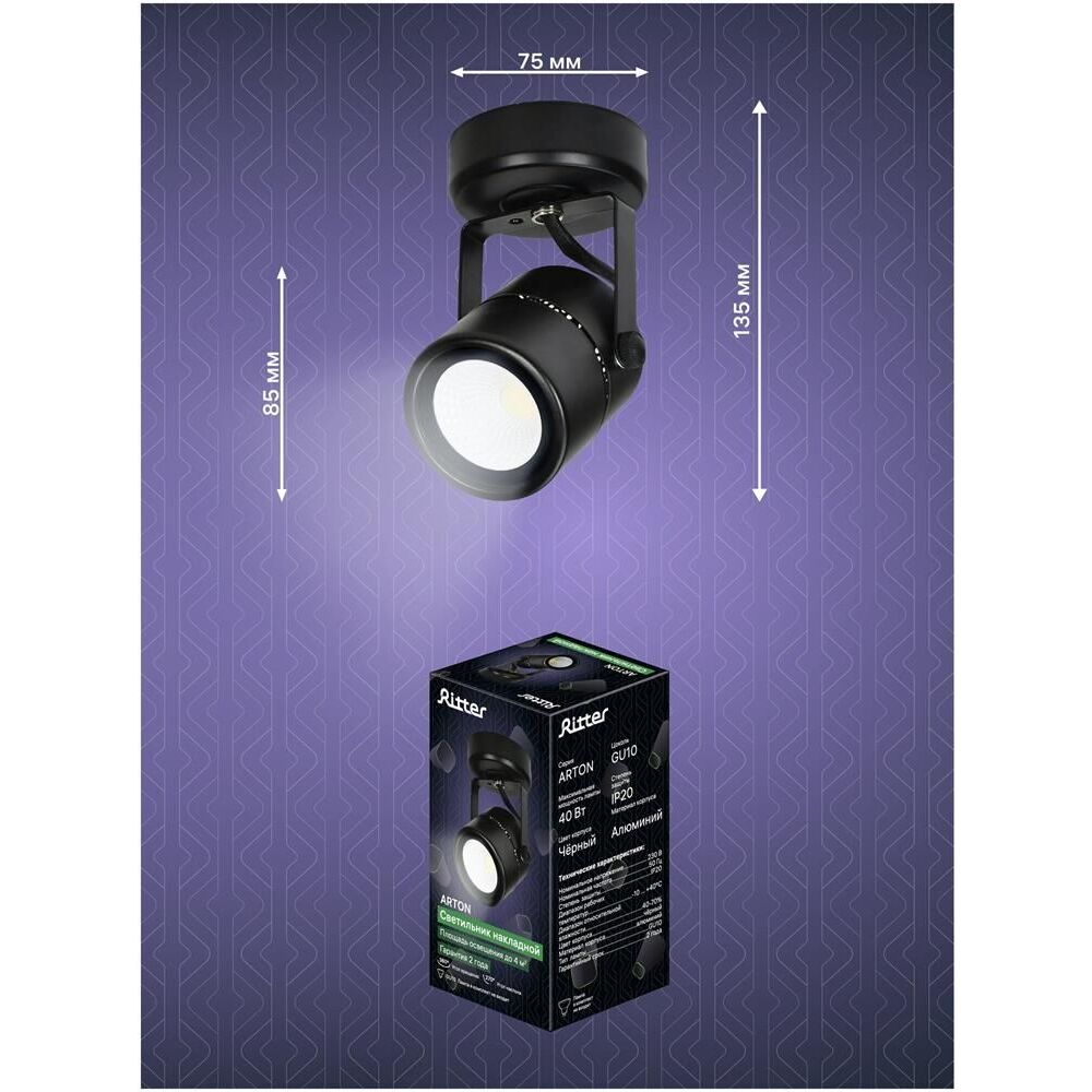Серия Arton Цвет корпуса черный Материал корпуса алюминий Длина 60 мм Ширина 90 мм Высота 140 мм Номинальная частота 50 Гц Номинальное напряжение 230 В Степень защиты IP20 Тип лампы GU10 Максимальная мощность лампы до 40 Вт