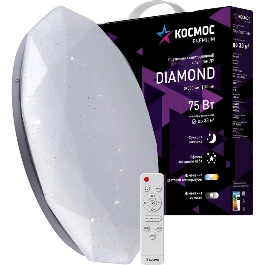 Светодиодный настенно-потолочный светильник Космос Premium Diamond - прекрасное решение для организации основного или дополнительного освещения офисных, торговых или жилых помещений. Плафон стилизован под поверхность ограненного алмаза. Регулировка цветовой температуры и мощности светового потока от 10 до 100% позволяет моделировать освещение по вашему вкусу. Имеется функция ночника. Доступны светильники с 3-я различными уровнями мощности для различных помещений, 55/75/120 Вт.
