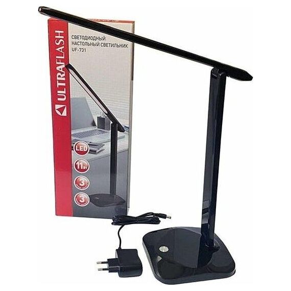 Настольный светильник Ultraflash UF-731 C02 черный, источник света - встроенные светодиоды, питание ~230В, 50Гц, мощность 11Вт, три уровня яркости, три цветовые температуры (3000К, 4500К, 6500К). Световой поток - 500лм, материал - пластик. Гарантия 12 месяцев