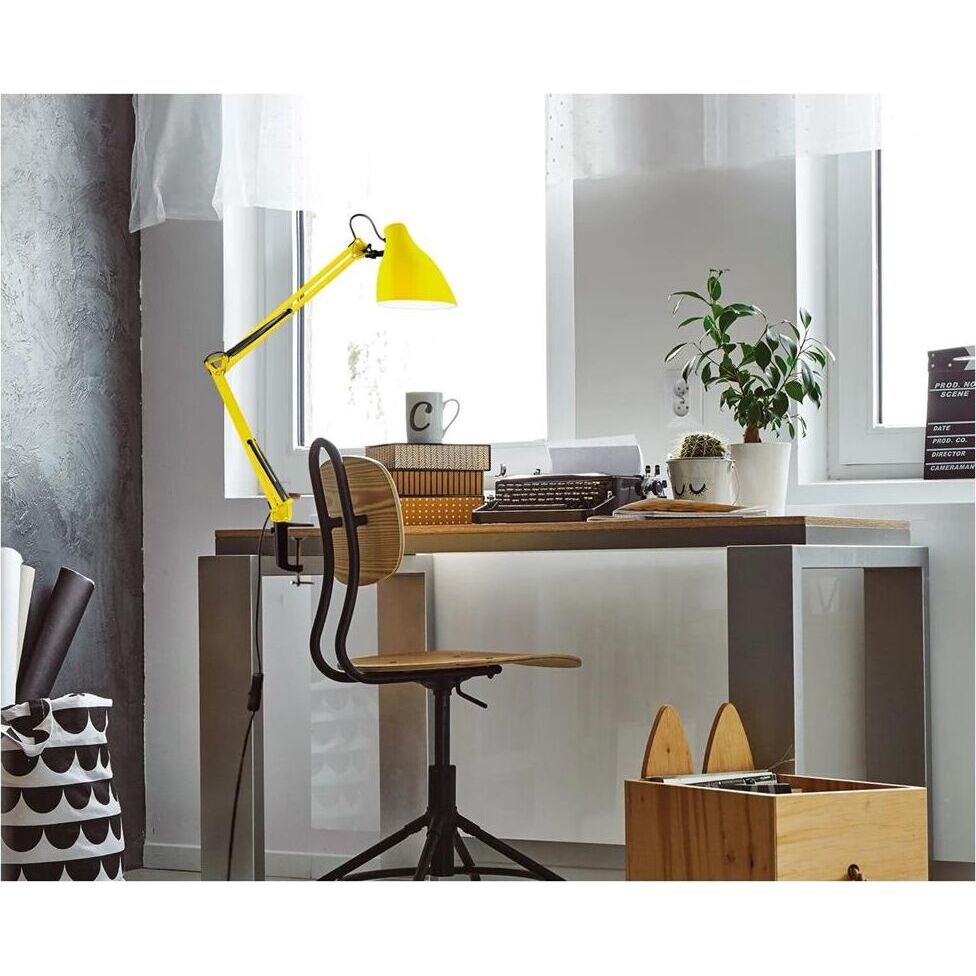 "Светильник KD-335 C07 желтый универсальная модель настольного светильника на металлической струбцине, предназначенная для освещения рабочего места, места чтения, уч бы. Может использоваться в офисных и домашних интерьерах, оформленных в разных стилях. Стойка, состоящая из двух 40-сантиметровых звеньев, и плафон неоычной формы изготовлены из металла. Матовое, не глянцевое окрашивание корпуса прида т светильнику дополнительный шарм и современный стиль. Светильник можно использовать с любыми типами ламп, в том числе со светодиодными. Устойчивая металлическая струбцина надежно прикрепляет светильник к любой горизонтальной поверхности толщиной до 5 см. Плафон над жно фиксируется в нужном положении винтовыми зажимами. Регулировка высоты и угла поворота плафона возможна в широком диапазоне. С выключателем на проводе. Стиль - LOFT. Будет гармонично смотреться в классическом интерьере и в современных интерьерах стилей лофт, техно и скандинавский."