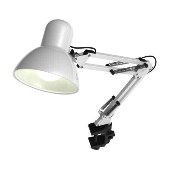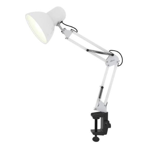 Настольный светильник, цоколь Е27 (до 40 Ватт), вращаетсяна 360', высота 2*18,5 см, на пластиковой струбцине, питание (AC) 220В, встроенный кабель питания 1,5м, выключатель. Светодиодная лампочка 7 Ватт в комплекте. Основной материал: металл; с элементами пластика.