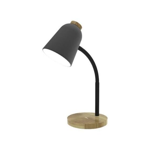 Настольный светильник, цоколь Е27 (до 40 Ватт), на круглой подставке, абажюр металл d.12см, подставка d.15см дерево, высота 50 см. Питание (AC) 220В, встроенный кабель питания 1,5м, с выключателем, длина гибкой ноги 50см. Светодиодная лампочка 7 Ватт в комплекте. Основной материал: металл; с элементами ДСП и резины.