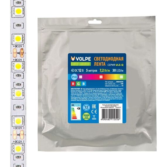 ЭЛЕКТРИКА VOLPE (UL-00004541) ULS-Q210 5050-30LED/m-10mm-IP20-DC12V-7,2W/m-5M-RGB катушка в герметичной упаковке