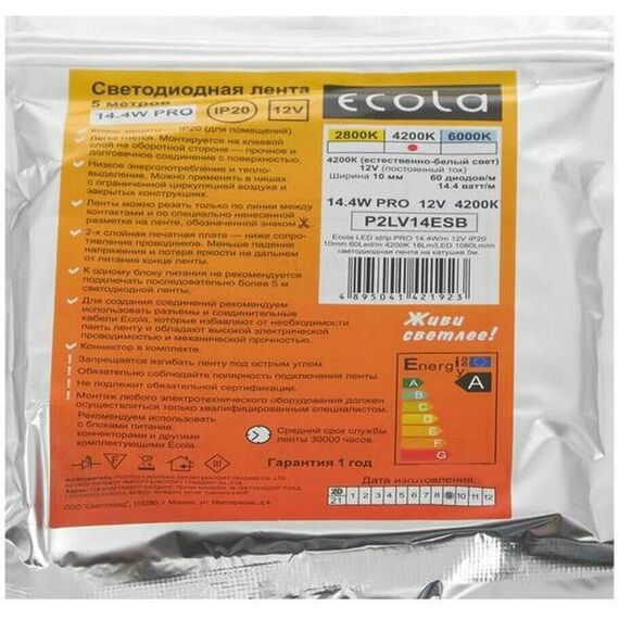 ECOLA LED strip PRO 14.4W/m 12V IP20 10mm 60Led/m 4200K 18Lm/LED 1080Lm/m светодиодная лента на катушке 5м. Степень защиты IP20 Мощность 14,4W/M Напряжение 12V Кол-во диодов на метр 60LED/M Цвет 4200K Яркость 1080LM/M Ширина ленты/сечение 10мм Длина ленты 5м