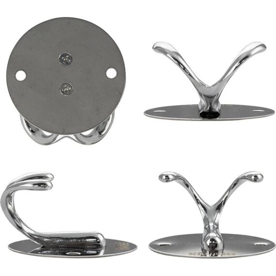 Крючок для принадлежностей металлический, хромированный, двойной. Изготовлен из прочной нержавеющей стали с хромированным покрытием, которое придает безупречный стильный вид и долговечность. Хромированное покрытие очень стойко переносит истирания и обеспечивает зеркальный блеск изделия. На держателе с легкостью можно размещать вещи для сушки или вешать, как полотенца, так и одежду перед походом в душ. Идеально подойдет не только для ванной, но и для кухни, а также для дачи или гаража - при необходимости на держатель можно вешать любые предметы. Изделие крепится к стене с помощью дюбелей и саморезов (входят в комплект). Габаритные размеры: диаметр 60 мм, глубина 35 мм. Вес - 0,045 кг, объём - 0,00016 м3.