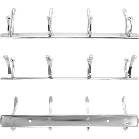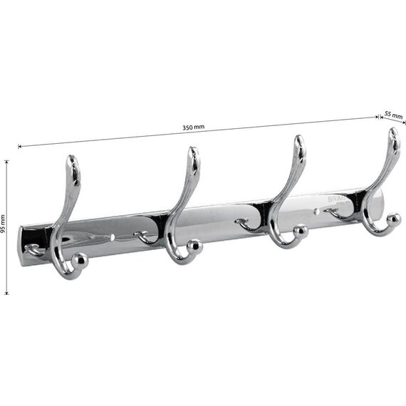 Вешалка - держатель для принадлежностей, металлический, хромированный, с четырьмя двойными крючками. Изготовлен из прочной нержавеющей стали марки SUS 304 с хромированным покрытием, которое придает безупречный стильный вид и долговечность. Хромированное покрытие очень стойко переносит истирания и обеспечивает зеркальный блеск изделия. На держателе с легкостью можно размещать вещи для сушки или вешать, как полотенца, так и одежду перед походом в душ. Идеально подойдет не только для ванной, но и для кухни, а также для дачи или гаража - при необходимости на держатель можно вешать любые предметы. Изделие крепится к стене с помощью дюбелей и саморезов (входят в комплект). Габаритные размеры: длина 350 мм, высота 95 мм, глубина 55 мм. Вес - 0,400 кг, объём - 0,00133 м3.