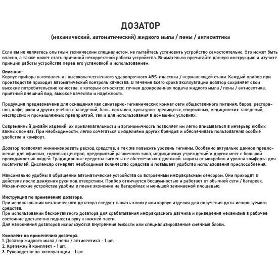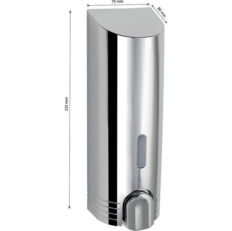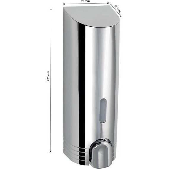 Механический дозатор для жидкого мыла, хромированный, предназначен для установки в любых санитарно-гигиенических комнатах. Имеет ключ и пластиковый замок. Дозатор прост в эксплуатации, достаточно нажать на кнопку для получения порции средства. Для удобства контроля за уровнем мыла на лицевой поверхности есть смотровое окно. Корпус диспенсера изготовлен из прочного пластика АБС хромированный, который выдерживает различные механические воздействия. В резервуар емкостью 300 мл можно заливать как жидкое мыло, так и прочие средства. Разместив диспенсер на стене, достаточно время от времени проверять заполненность резервуара. Иного ухода он не требует, не нуждается в замене батареек. Это отличное решение как для частных владений, так и для гостиниц, кафе, столовых и прочих общественных мест. Габаритные размеры: высота 225 мм, ширина 75 мм, глубина 80 мм. Вес - 0,300 кг, объем - 0,00190 м3.