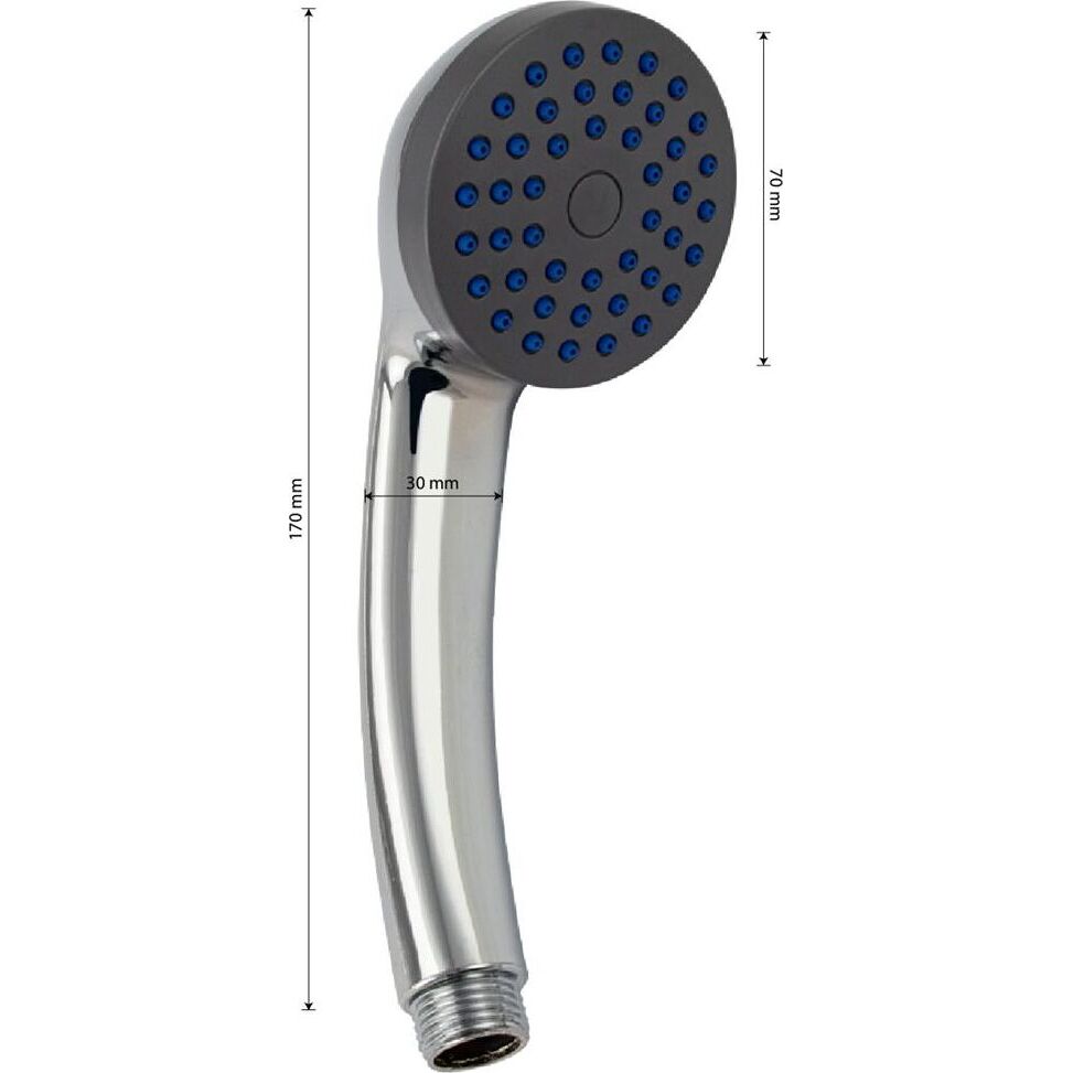 Душевая лейка отличается современным технологичным дизайном, высокой надежностью, долговечностью. Она изготовлена из влагостойкого пластика АБС и имеет декоративное покрытие цвета «хром», придающее устройству привлекательный вид и предохраняющее от агрессивного воздействия окружающей среды. Корпус отличается небольшим весом, что исключает повреждение напольной плитки или эмали ванны при случайном падении. Ухаживать за душевой лейкой легко. Глянцевую поверхность достаточно протереть мягкой салфеткой, она в течение долгого времени не потеряет своего блеска. Система помогает мгновенно очистить силиконовые форсунки душевой лейки от известкового налета и загрязнения. Габаритные размеры: высота 170 мм, диаметр лейки 70 мм, диаметр корпуса 30 мм. Вес - 0,100 кг, объём - 0,00080 м3.