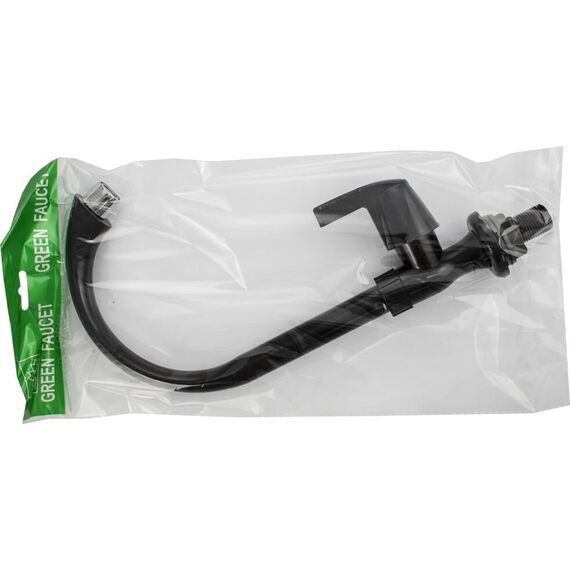 Кран на одну воду, из высокопрочного пластика АБС, черный, с аэратором для экономии воды, с высоким изливом. Крепление резьба - гайка. Кранбукса м/к, ручка флажок, поворот на 90˚. Габаритные размеры: высота 280 мм, длина 200 мм, диаметр посадочного седла 45 мм, длина резьбы 40 мм. Вес - 0,2 кг, объём - 0,0015 м3. В комплекте корпус, паспорт, крепёж