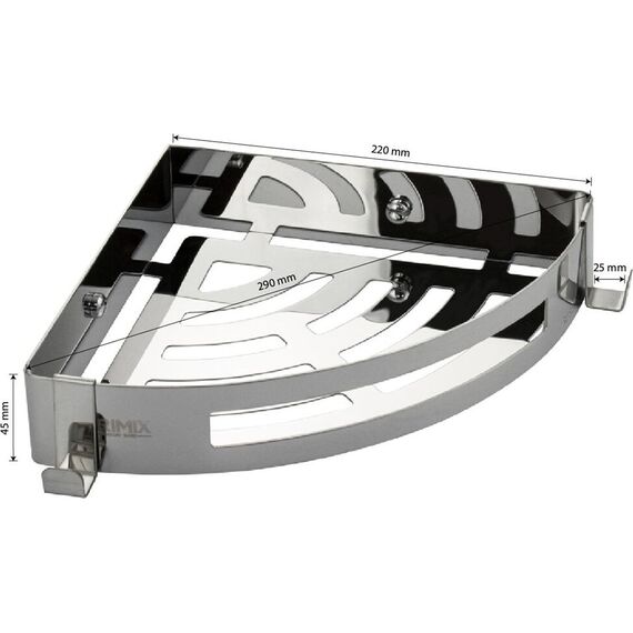 Полочка для принадлежностей, треугольная, угловая, с литым дном, однаэтажная, с двумя крючками, обладает высокими эксплуатационными характеристиками и подходит для использования дома, в общественных местах: отелях, ресторанах и пр. Изготовлена из прочной нержавеющей стали с хромоникелевым покрытием, которое придает безупречный глянцевый блеск и долговечность. Аксессуар не занимает много места, надежно фиксируется к стене при помощи набора креплений (входят в комплект) и служит удобным местом для хранения бытовых и косметических средств. Габаритные размеры: высота 45 мм, ширина 290 мм, глубина 220 мм. Вес - 0,700 кг, объём - 0,00378 м3.