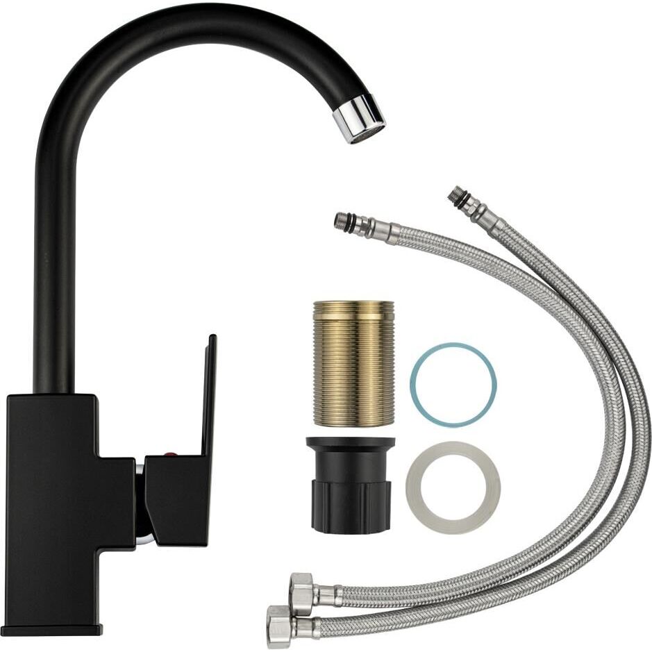Смеситель для кухонной мойки и раковин, из высокопрочного пластика АБС, ЧЕРНЫЙ, боковой, с высоким С-образным изливом, шаровый, квадратный корпус. Крепление резьба - гайка, картридж d = 40 мм, литая ручка. Хромированный аэратор для экономии воды. Габаритные размеры: высота 33.5 мм, длина 200 мм, посадочное седло 50*50 мм, длина резьбы 45 мм, длина подводки 450 мм. Вес - 0.70 кг, объём - 0.00423 м3. В комплекте паспорт, корпус с изливом, пластиковая подводка с латунными штуцерами 1/2, крепеж, набор прокладок.
