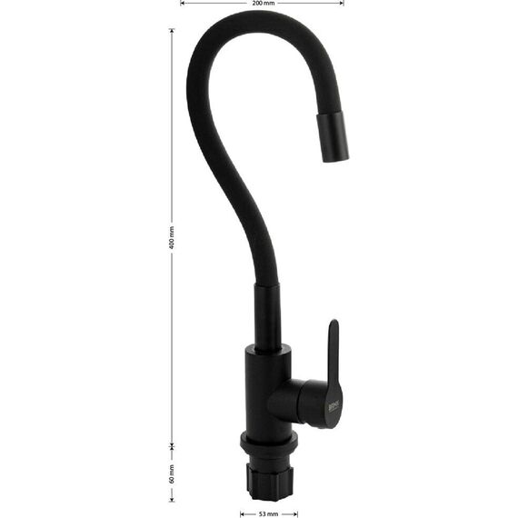 Смеситель для кухонной мойки и раковин, литой матовый корпус, из нержавеющей стали марки 304, с высоким гибким изливом, чёрного цвета, с аэратором для экономии воды, шаровый. Крепление резьба - гайка, картридж d = 35 мм, ручка литая. Такая модель может использоваться на домашней кухне, на даче, в медицинских учреждениях и общественных местах. Габаритные размеры: высота до 400 мм, длина до 300 мм, диаметр посадочного седла 45 мм, длина резьбы 65 мм, длина подводки 400 мм. Вес - 1,74 кг, объём - 0,005 м3. В комплекте паспорт, корпус с изливом, подводка 1/2, крепеж, набор прокладок.