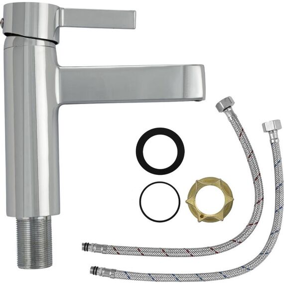 Смеситель для раковины, хромированный, с коротким изливом, литой корпус, ручка литая, шаровый. Материал изготовления — ЦАМ (цинк-алюминий-медь) + нержавеющая сталь. Крепление резьба - гайка, картридж d = 35 мм. Аэратор для экономии воды. Габаритные размеры: высота мм, длина мм, длина излива мм, диаметр посадочного седла мм, длина подводки 500 мм. Вес - кг, объём - м3. В комплекте паспорт, корпус, подводка 1/2, крепеж, набор прокладок.
