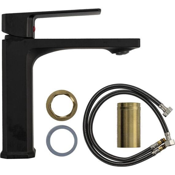Смеситель для раковины, квадратный литой корпус, цвет черный, с прямым плоским изливом, ручка литая, шаровый. Крепление резьба - гайка, картридж d = 35 мм. Аэратор для экономии воды. Такая модель может использоваться на домашней кухне, на даче, в медицинских учреждениях и общественных местах. Габаритные размеры: высота 190 мм, длина 180 мм, посадочное седло 45 мм, длина резьбы 50 мм, длина подводки 500 мм. Вес - 1,45 кг, объ м - 0,00307 м3. В комплекте паспорт, корпус, подводка 1/2, крепеж, набор прокладок.