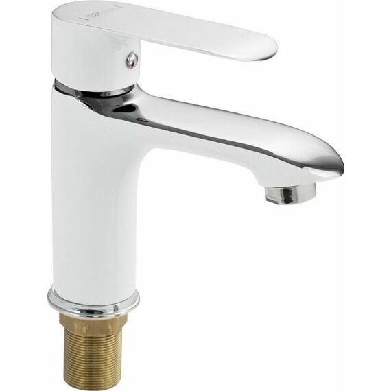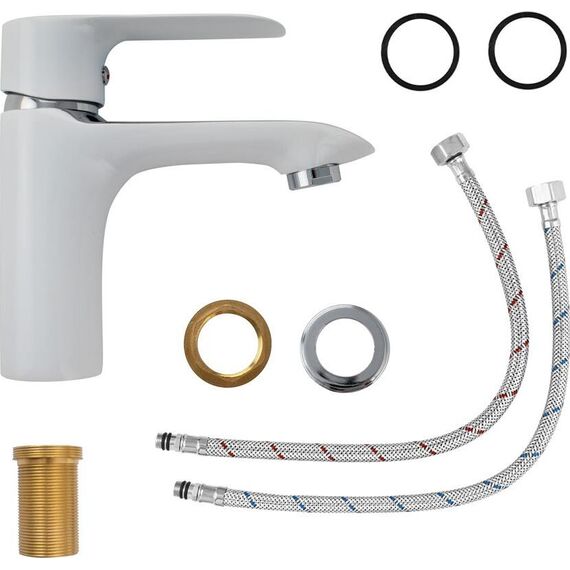 Смеситель для раковины, корпус комбинированный - белая эмаль с хромом, с коротким изливом, литой корпус, литая ручка, шаровый. Материал изготовления — ЦАМ (цинк-алюминий-медь) + нержавеющая сталь. Крепление резьба - гайка, картридж d = 35 мм. Аэратор для экономии воды. Габаритные размеры: высота 153 мм, длина 165 мм, длина излива 125 мм, диаметр посадочного седла 45 мм, длина резьбы 40 мм, длина подводки 500 мм. Вес - 1,400 кг, объём - 0,00355 м3. В комплекте паспорт, корпус, подводка 1/2, крепеж, набор прокладок.