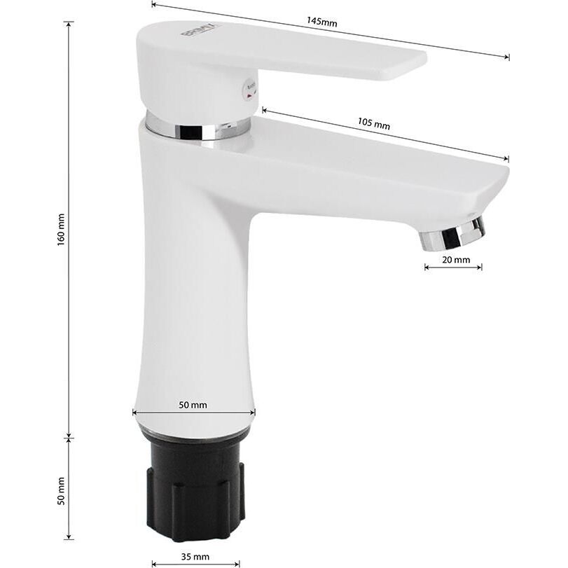 Смеситель для раковины, из высокопрочного пластика АБС, БЕЛЫЙ с коротким изливом, литой корпус, литая ручка, шаровый. Крепление резьба - гайка, картридж d = 40 мм. хромированный, аэратор для экономии воды. Габаритные размеры: высота 160 мм, длина 145 мм, длина излива 105 мм, диаметр посадочного седла 50 мм, длина резьбы 50 мм, длина подводки 400 мм. Вес - 0,600 кг, объём - 0,00417 м3. В комплекте паспорт, корпус, пластиковая подводка с латунными штуцерами 1/2, крепеж, набор прокладок.