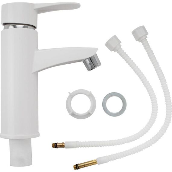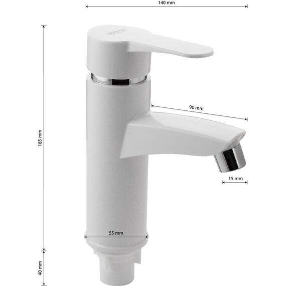 Смеситель для раковины, из высокопрочного пластика АБС, БЕЛЫЙ с коротким изливом, литой корпус, литая ручка, шаровый. Крепление резьба - гайка, картридж d = 40 мм. хромированный аэратор для экономии воды. Габаритные размеры: высота 185 мм, длина 140 мм, длина излива 90 мм, диаметр посадочного седла 55 мм, длина резьбы 40 мм, длина подводки 400 мм. Вес - 0,600 кг, объём - 0,00417 м3. В комплекте паспорт, корпус, пластиковая подводка с латунными штуцерами 1/2, крепеж, набор прокладок.
