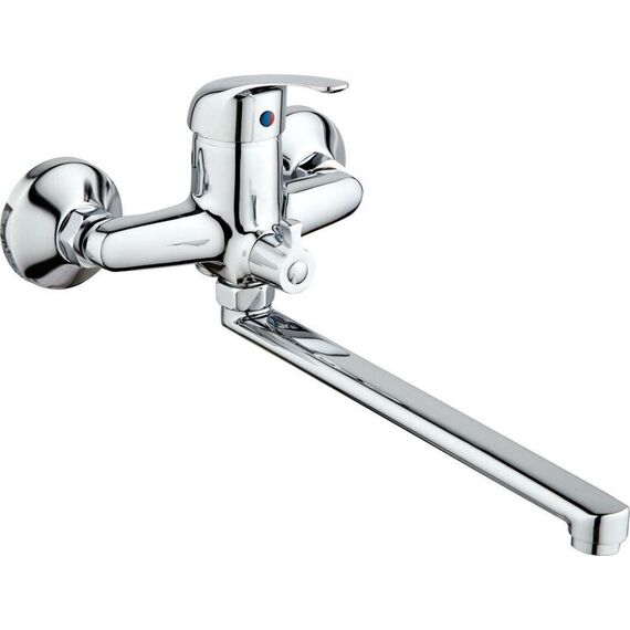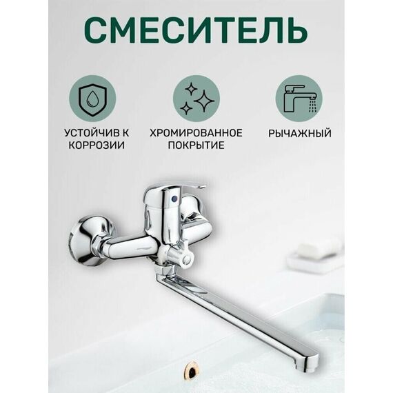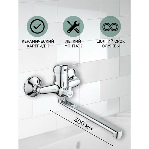 Смеситель универсальный с плоским прямым изливом и переключателем для душа - Покрытие корпуса: хром - Картридж керамический 40 мм - Шланг длины 1,5 м - С поворотным изливом 300 мм - В комплекте с лейкой