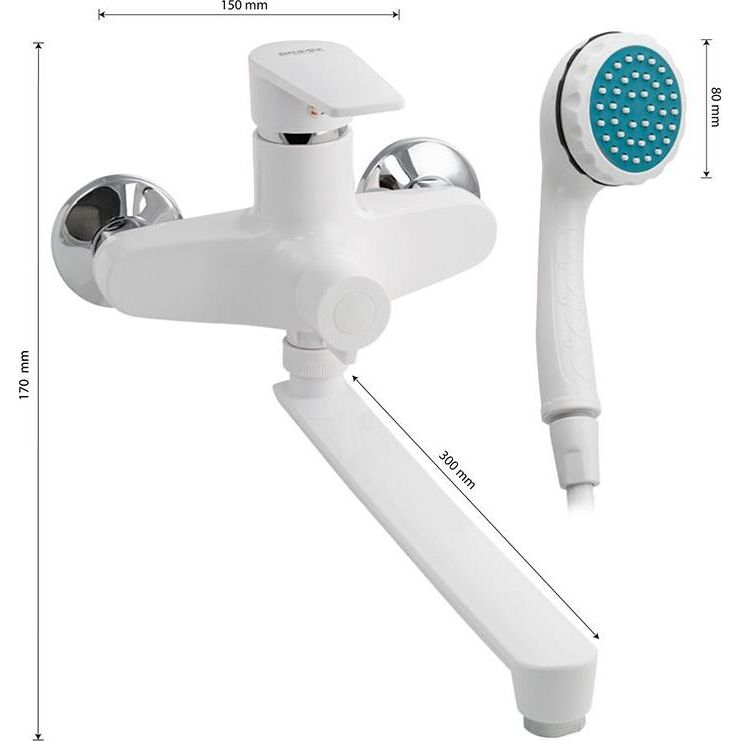 Смеситель из высокопрочного пластика АБС, БЕЛЫЙ в ванную / душевую комнату с длинным, плоским изливом, литой корпус, шаровый с дивертором м/к на корпусе. Картридж d = 40 мм, литая ручка, хромированный, аэратор для экономии воды, хромированные чашки и эксцентрики. Габаритные размеры: ширина 150 мм, высота корпуса 170 мм, длина излива 300 мм, душевая лейка d = 80 мм, шланг 150 см. Вес - 1 350 кг, объём - 0 00700 м3. В комплекте паспорт, корпус с изливом, дивертор, душевая лейка, шланг, кронштейн, комплект крепежа и прокладок.
