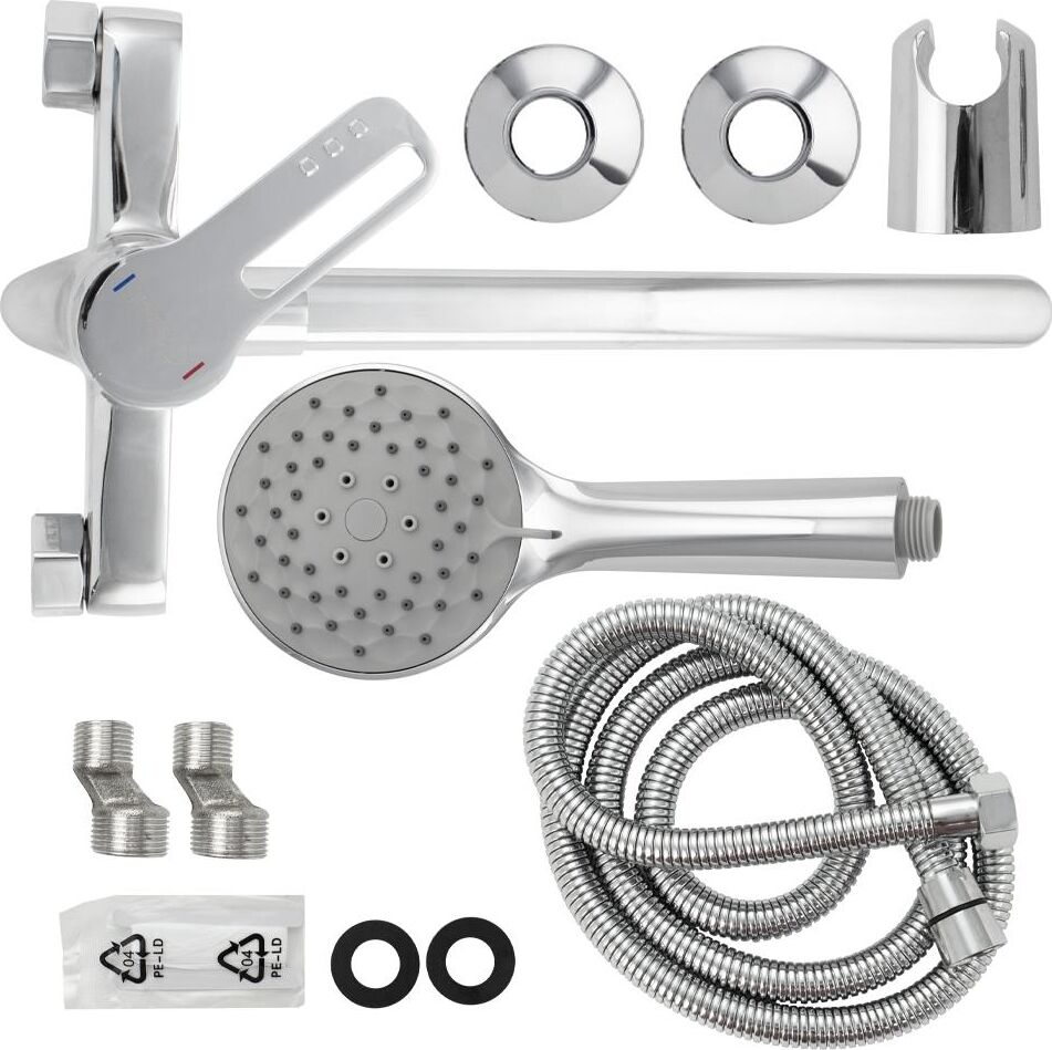 Смеситель хромированный в ванную/душевую комнату с длинным, плоским изливом, тяжёлый, массивный корпус, шаровый с дивертором м/к на корпусе. Картридж d= 35 мм, ручка с прорезью, аэратор для экономии воды, чашки и эксцентрики из нержавеющей стали. Габаритные размеры: ширина 150 мм, высота корпуса 140 мм, длина излива 330 мм, двухрежимная душевая лейка d = 105 мм, шланг 150 см, вес - 1,950 кг, объём - 0,00740 м3 . В комплекте паспорт, корпус с изливом, дивертор , душевая лейка, шланг, кронштейн, комплект крепежа и прокладок.