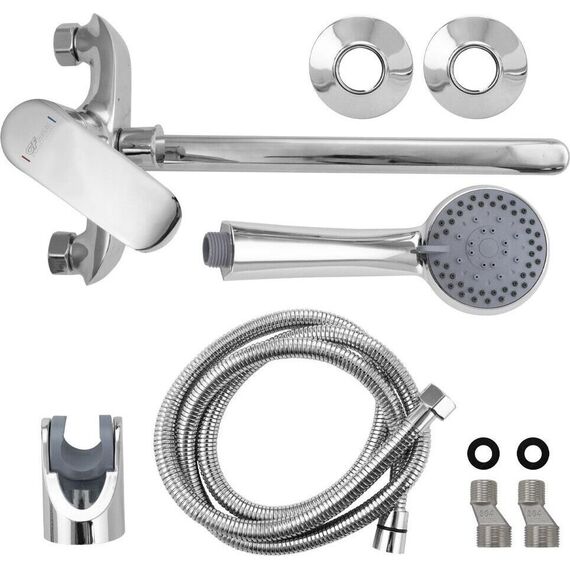 Смеситель хромированный в ванную / душевую комнату с длинным, плоским изливом, тяжёлый, массивный корпус, шаровый, с дивертором м/к на корпусе. Материал изготовления — ЦАМ (цинк-алюминий-медь) + нержавеющая сталь. Картридж d = 35 мм, литая ручка, аэратор для экономии воды, чашки и эксцентрики из нержавеющей стали. Габаритные размеры: ширина 150 мм, высота корпуса 150 мм, длина излива 340 мм, трёхрежимная душевая лейка d = 75 мм, шланг 150 см. Вес - 2,100 кг, объём - 0,00653 м3. В комплекте паспорт, корпус с изливом, дивертор, душевая лейка, шланг, кронштейн , комплект крепежа и прокладок.