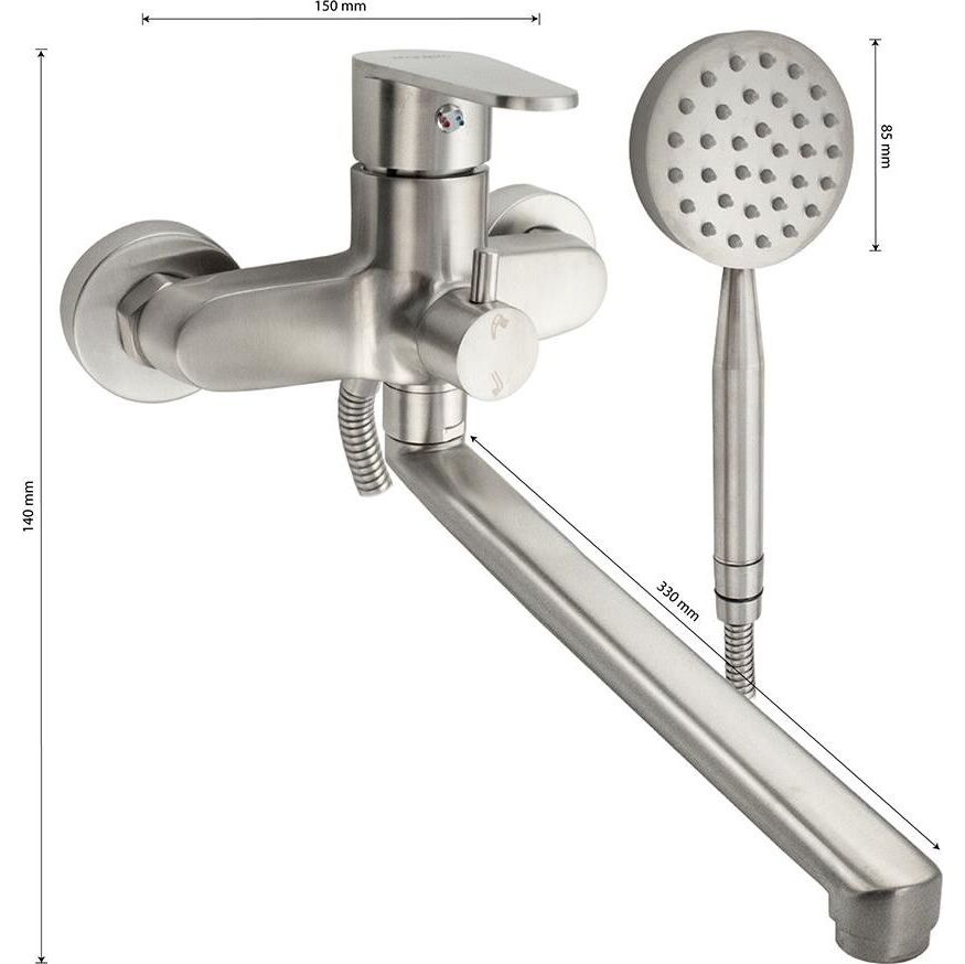 Смеситель матовый, из нержавеющей стали марки 304 в ванную / душевую комнату, с поворотным длинным плоским изливом. Картридж d = 40 мм, ручка литая. Дутый, большой корпус с дивертором м/к на корпусе, аэратор для экономии воды, чашки, гайки и эксцентрики из нержавеющей стали. Габаритные размеры: ширина 150 мм, высота 140 мм, длина излива 330 мм, диаметр чашки 60 мм, длина шланга 150 см, лейка d = 85 мм. Вес - 2,200 кг, объём - 0,00865 м3. В комплекте корпус с изливом, дивертор, кронштейн, паспорт, крепёж, прокладки, лейка, шланг.