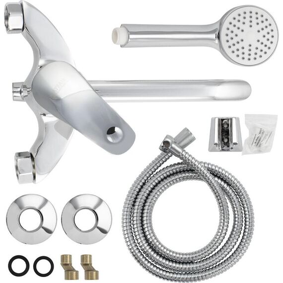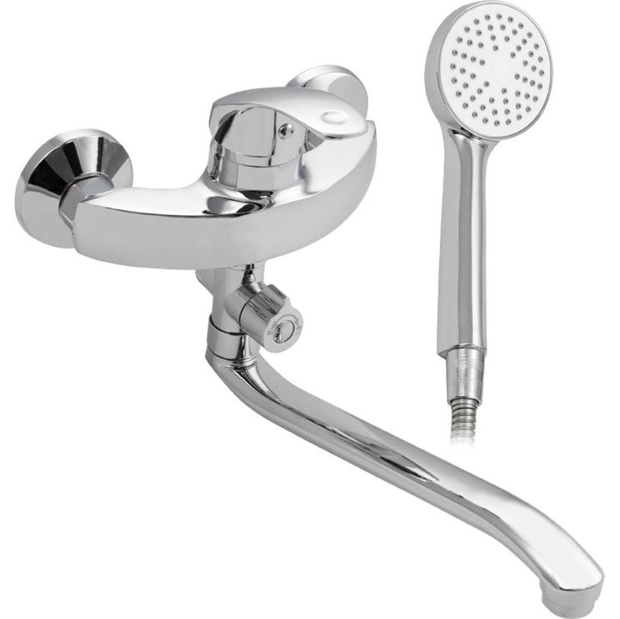 Смеситель хромированный в ванную / душевую комнату с длинным, плоским изливом, изогнутый дутый корпус, шаровый, с дивертором м/к. Материал изготовления — ЦАМ (цинк-алюминий-медь) + нержавеющая сталь. Картридж d = 40 мм, ручка литая, аэратор для экономии воды, чашки и эксцентрики. Габаритные размеры: ширина 150 мм, высота корпуса 190 мм, длина излива 300 мм, душевая лейка d = 78 мм, шланг 150 см. Вес - 1,400 кг, объём - 0,00435 м3. В комплекте паспорт, корпус с изливом, дивертор, душевая лейка, шланг, кронштейн, комплект крепежа и прокладок.