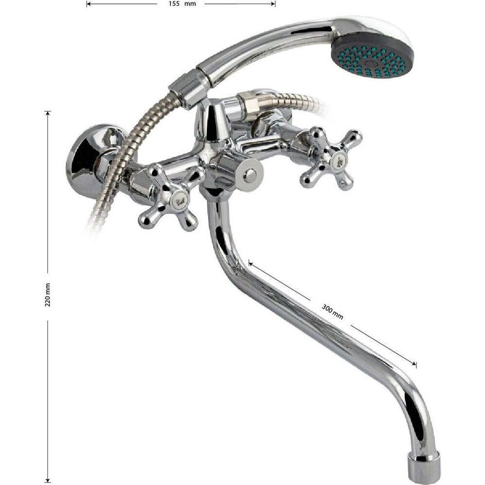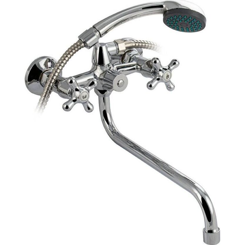 Смеситель хромированный в ванную/душевую комнату с длинным изливом. Материал изготовления — ЦАМ (цинк-алюминий-медь) + нержавеющая сталь. Кранбуксы металлокерамика 1/2, ручки крест поворот на 90˚. Дутый, большой корпус с шаровым переключением подачи воды, аэратор для экономии воды, подставка - "рога" для лейки, чашки нержавеющая сталь, гайки и эксцентрики из нержавейки. Габаритные размеры: ширина 150 мм, высота 240 мм, длина излива 350 мм, диаметр чашки 60 мм, длина шланга 150 см, лейка d = 65 мм. Вес - 1,300 кг, объём - 0,00364 м3. В комплекте корпус с изливом, паспорт, крепёж, прокладки, лейка, шланг.