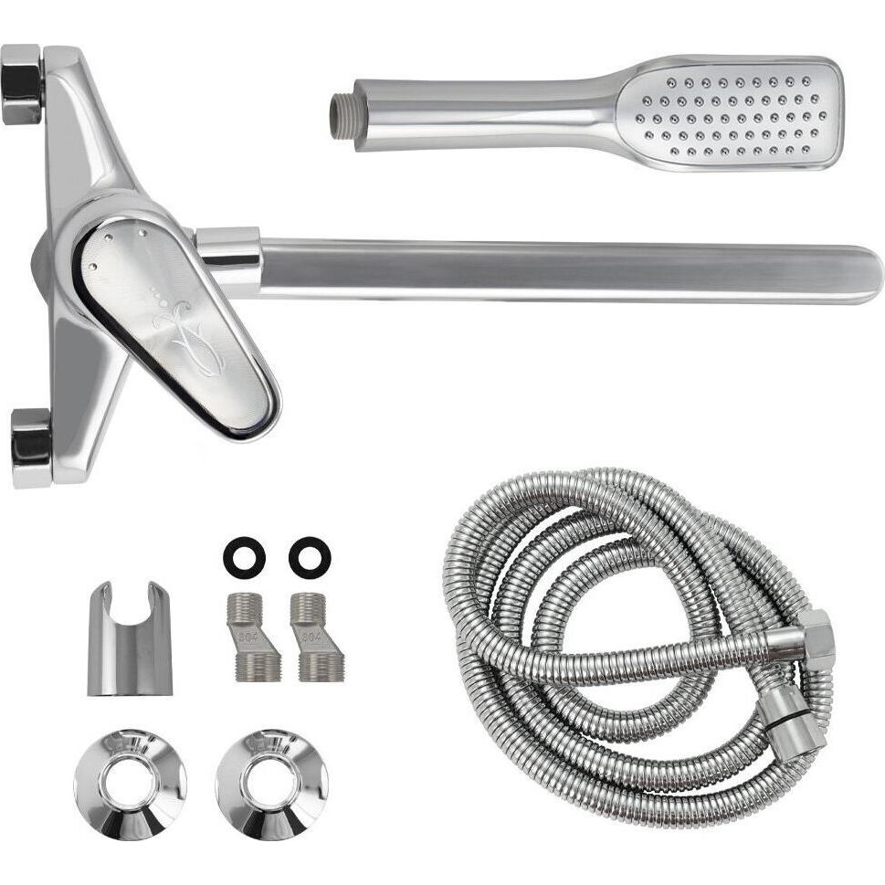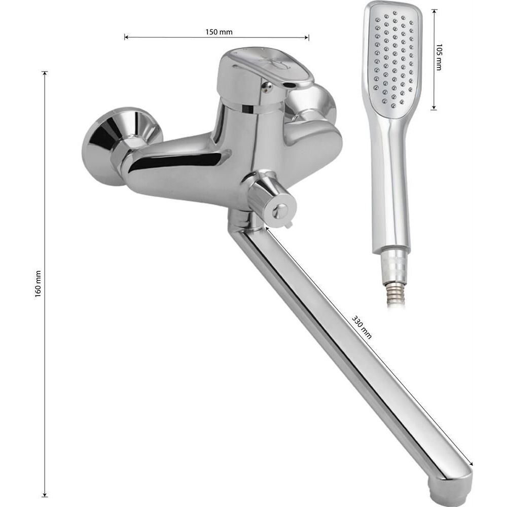 Смеситель хромированный в ванную / душевую комнату, с длинным плоским изливом, шаровый, с дивертором м/к на корпусе. Материал изготовления — ЦАМ (цинк-алюминий-медь) + нержавеющая сталь. Картридж d = 40 мм, сатеновая ручка с узором, аэратор для экономии воды, чашки и эксцентрики. Габаритные размеры: ширина 150 мм, высота корпуса 160 мм, длина излива 330 мм, душевая лейка 105 мм, шланг 150 см. Вес - 2,000 кг, объём - 0,00864 м3. В комплекте паспорт, корпус с изливом, дивертор, душевая лейка, шланг, кронштейн, комплект крепежа и прокладок.