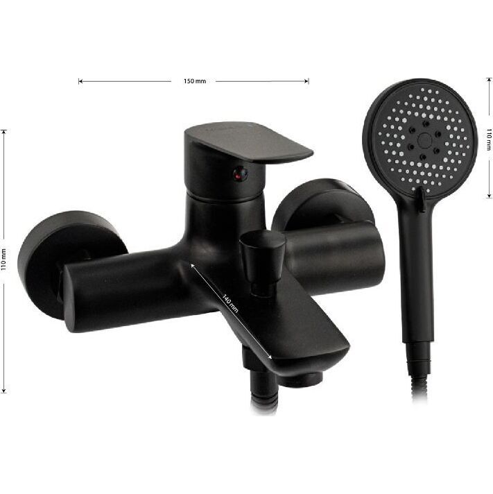 Смеситель в ванную/душевую комнату, чёрного цвета, с коротким изливом, литой корпус, шаровый с поворотным дивертором м/к на корпусе. Материал изготовления — ЦАМ (цинк-алюминий-медь) + нержавеющая сталь. Картридж d = 40 мм, ручка литая, аэратор для экономии воды, чашки и эксцентрики из нержавеющей стали. Габаритные размеры: ширина 150 мм, высота корпуса 110 мм, длина излива 140 мм, круглая двухрежимная душевая лейка d = 110 мм, шланг 150 см. Вес - 1,98 кг, объём - 0,006 м3. В комплекте паспорт, корпус с изливом, дивертор, душевая лейка, шланг, кронштейн, комплект крепежа и прокладок.